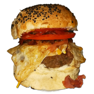Muzzarella, mayonesa, salsa tabasco, catalanes, cebolla, carne de 200gr y papas fritas.